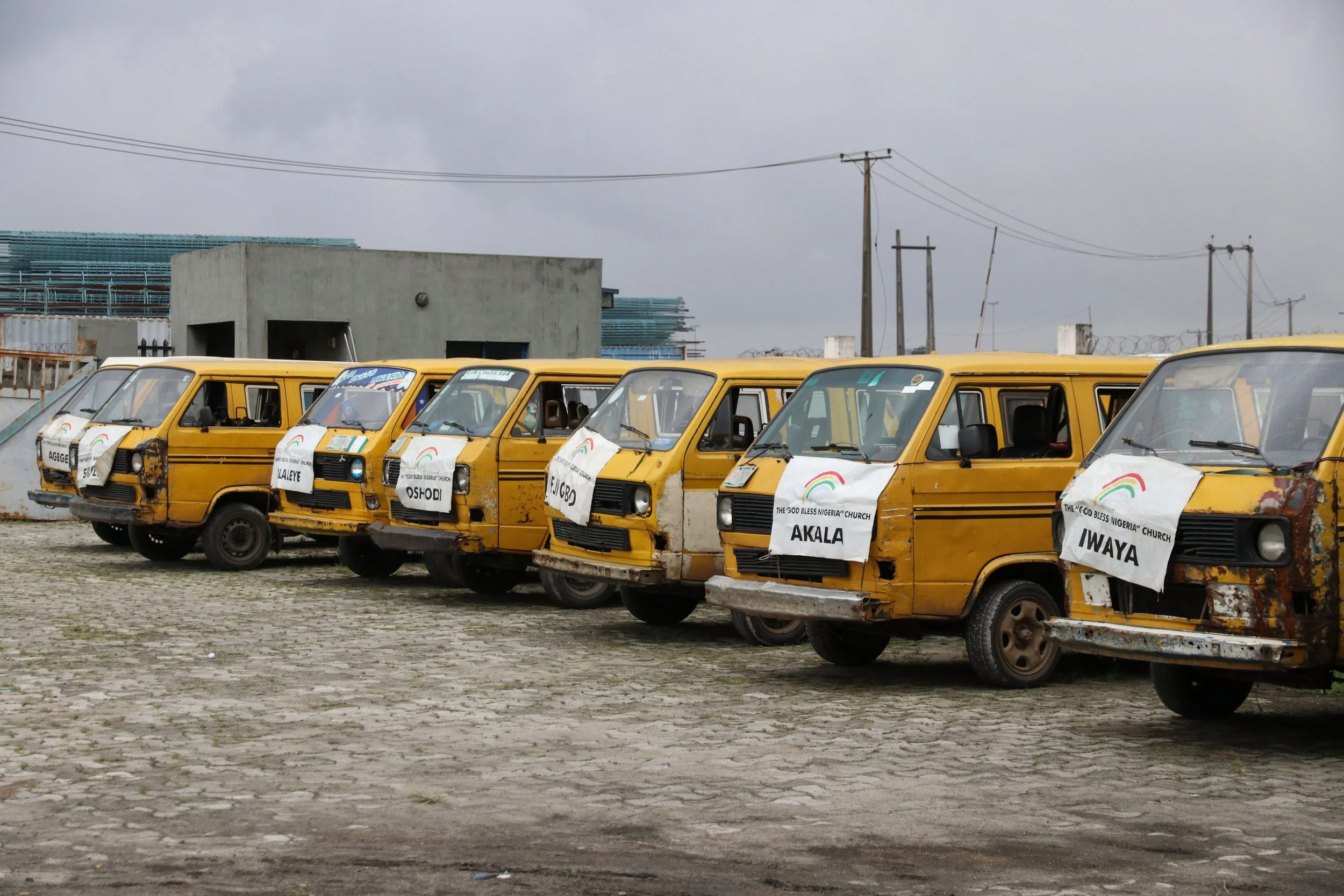 One by one, the signature yellow vans of Lagos roll up to the front doors of the former Media Center of the News Agency of Nigeria. Before they even come to a stop, the doors slide open and nearly a dozen people begin spilling out of each one into the parking lot.
